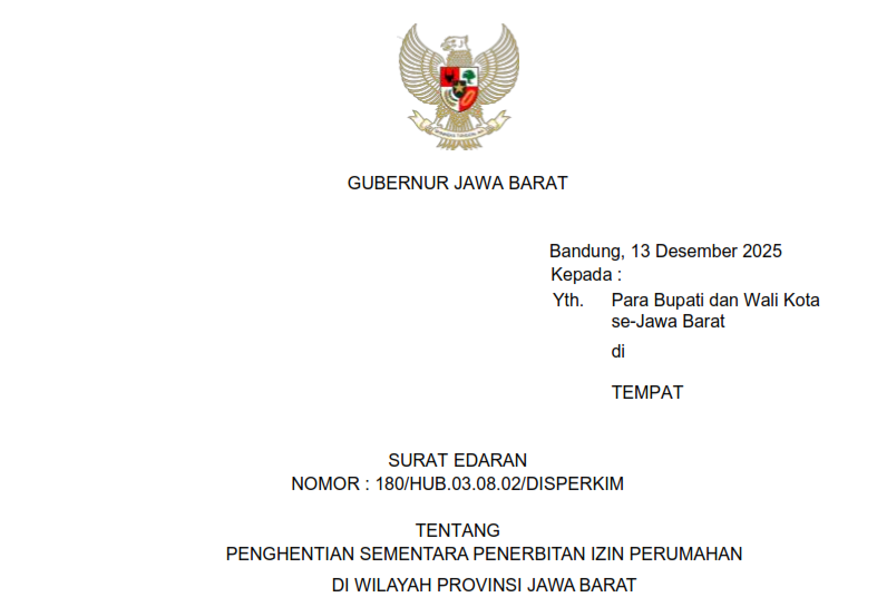 SURAT EDARAN GUBERNUR JAWA BARAT NOMOR : 180/HUB.03.08.02/DISPERKIM TENTANG PENGHENTIAN SEMENTARA PENERBITAN IZIN PERUMAHAN DI WILAYAH PROVINSI JAWA BARAT