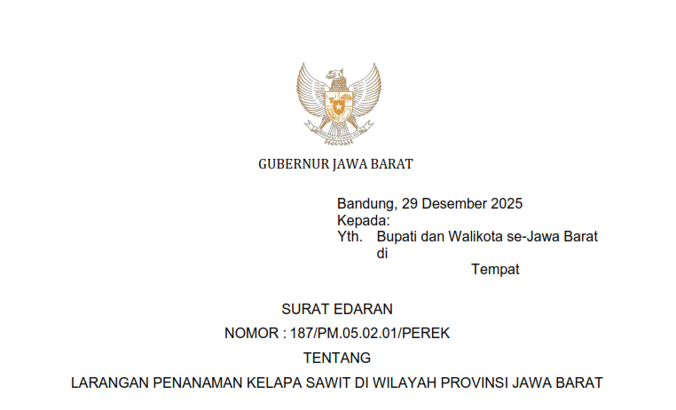 SURAT EDARAN GUBERNUR JAWA BARAT NOMOR : 187/PM.05.02.01/PEREK TENTANG LARANGAN PENANAMAN KELAPA SAWIT DI WILAYAH PROVINSI JAWA BARAT